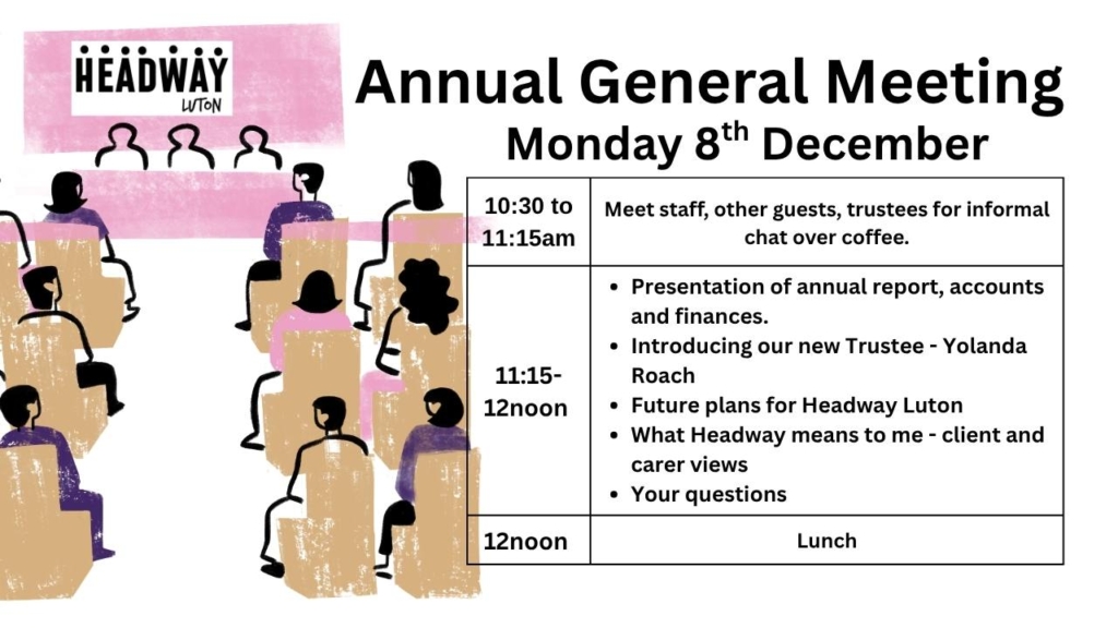 11:15 to 12 noon meeting starts and includes the trustees annual report, review of accounts, plans for the future and opportunities to hear what Headway Luton means to clients and carers.